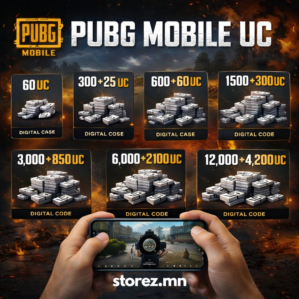 | хэмжээ | 60 UC, 300+25, 360+25 UC, 600+60 UC, 900+85 UC, 1500+300 UC, 3000+850 UC, 6000+2100 UC, 12000+4200 |